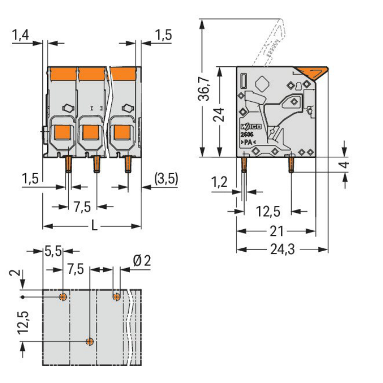 WAGO | 2606-1102/020-005 | PCB TERMINAL BLOCK; LEVER; 6 MM²;