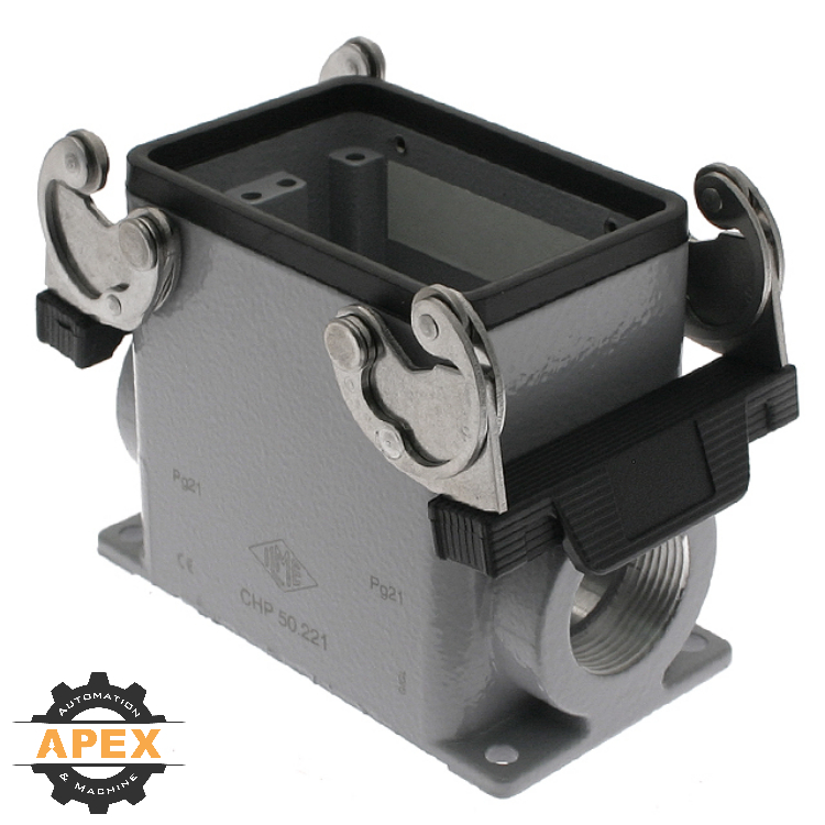 ILME is a globally recognized leader in the heavy duty industrial connector industry. The standard aluminum die cast enclosures (Hoods/Bases) use a patented stainless steel locking system that provides consistent clamping force and IP65 protection even after 500 mating cycles. Hoods and surface mount bases come with a wide range of PG, Metric, or NPT openings. Single lever, double lever, center latch, top entry, front entry, side entry, high construction, surface mount, bulkhead mount, and extra large options are just a few of the available solutions offered to meet your specific application.