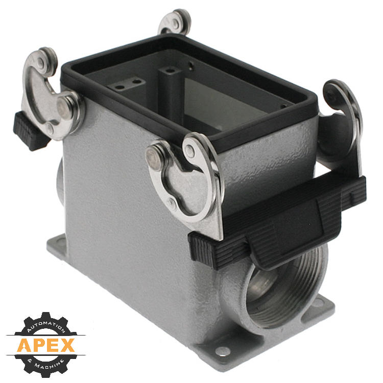 ILME is a globally recognized leader in the heavy duty industrial connector industry. The standard aluminum die cast enclosures (Hoods/Bases) use a patented stainless steel locking system that provides consistent clamping force and IP65 protection even after 500 mating cycles. Hoods and surface mount bases come with a wide range of PG, Metric, or NPT openings. Single lever, double lever, center latch, top entry, front entry, side entry, high construction, surface mount, bulkhead mount, and extra large options are just a few of the available solutions offered to meet your specific application.